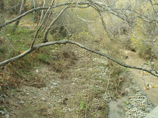 We finally got back to what we like best, walking on the beach. Each day wer are amazed at how the beach changes. Last year there were not many storms, so for the most part the sand stayed put, but this year its a different beach every time we walk. The picture on the left is of beach erosion, the sand used to be level, but high tides caused a little cliff. I took this picture last week and today it was still present. The water in front is run off - I've read that takes about 2 hours for the first water to appear after the rain starts, in the mountains , and then seems to slowly receed. Today this spot continues to be too deep and move to fast to wade across.